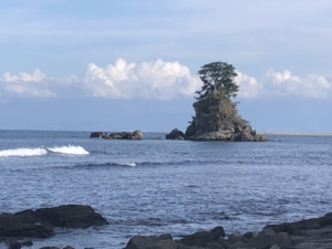昼食後雨晴海岸で義経と同様に雨宿りをして帰りました。源義経が奥州へ落ち延びる途中、にわか雨が晴れるのを待ったという岩、 それでこの地名が「雨晴」となったと言われています。 氷見漁港場外市場氷見番屋街に立ち寄り名物の鱒ずし購入。かなり立派な施設でした。👍👍