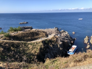 長距離でしたが福井の東尋坊到着、お店を見学しながら断崖岸壁で自殺の名所である東尋坊の先端まで散策、観光船もあったが時間も無いので乗船せず次の観光地へ。