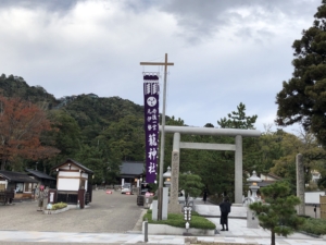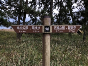 日本三景の一つ「虹の松原」散策、知恩院見学後、虹の松原を散策しながら妻は反対側の竃神社まで散策 雨も降ってきて状況が悪くなったので私は車で反対側に移動して妻を乗せた。