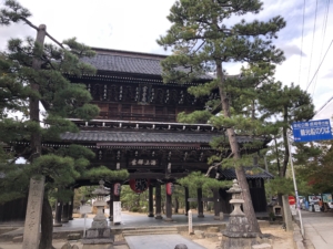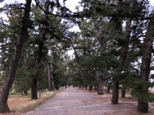 日本三景の一つ「虹の松原」散策、知恩院見学後、虹の松原を散策しながら妻は反対側の竃神社まで散策 雨も降ってきて状況が悪くなったので私は車で反対側に移動して妻を乗せた。
