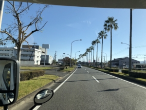 その後青島神社へ 向かう途中の道路には南国のヤシの並木が連なり、また11月末とは思えない暑さとで南国の気分を満喫しながら走行しました。 流石南国宮崎!・・