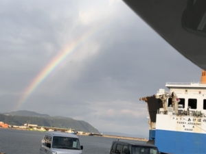 出港時に突然現れた虹、これからの旅を祝福しているかのようでした。