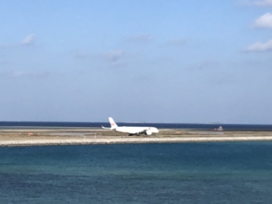 今日も晴天、12月中旬とは思えない暑さ 那覇市の最高気温がは25度だったそうです。 昨日ゆっくり休んだので今日は市内散策しました。 最初は「瀬長島ウミカジテラス」ヘ 那覇空港に一番近いリゾートアイランド、ヨーロッパ風の白いテラスやショップが有り沖縄の野菜や果物、こだわりのスイーツ、レストランなどが立ち並ぶ沖縄の新しいスポット。 また那覇空港から離着陸する旅客機や戦闘機が目前で見えとても迫力が有りました。
