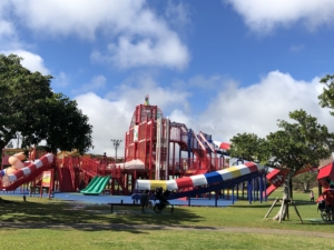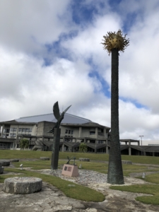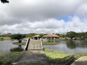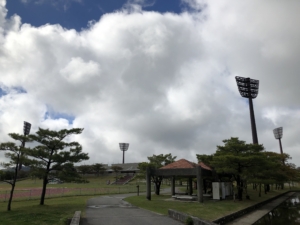 今日はクリスマスイブ、仙台に居た頃のクリスマスとは大分環境や気候が違いクリスマスと言うう感覚が全くありませ~~ん。 日中の散歩スタイルは半ズボンに半袖のティーシャツ1枚で歩いて来ました。 周りを見るとしっかり冬スタイルの沖縄人・・・が 何か場違いの様な気がしました。 でも平気です・・! 何故なら誰も知らないから(笑) 午前中はタピック県総ひやごんスタジアム(沖縄総合運動公園)を散策しました。 施設命名権によってタビックけんそうひやんごんスタジアムの呼称を用いているそうです。 1987年第42回国民体育大会の開催に合わせて建設され、メイン会場として使用され、その後全国高等学校総合体育大会やサッカー、ラグビーの試合に利用されたそうでとても大きな施設でした。 また公園内にはオートキャンプ場や子供たちの遊び場・プールなどの施設等・・・ どの位のお金を注ぎ込んだのだろうか?と思いながら散策させて頂きました。 沖縄には各市町村にこの程度の公園が沢山有り、道路を走行中に数キロおきに有り良く管理されていました。 しかしながら管理が厳しく時間になると公園から強制的に締め出され、我々キャンピングカー族には車中泊できない事が非常に残念でした。 また管理されているビーチも同じで宿泊場所を探すのに大変なストレスでした。