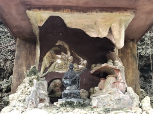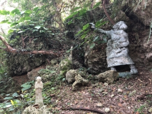 午後、シムクガマ、チビチリガマ、さとうきび畑歌碑広場に立ち寄り残波岬へ 読谷村は戦争によって多くの住民が亡くなりました。 また多いときは95%の土地が米軍基地として占有されていましたが少しずつ返還されているようです。 1945年4月1日米軍が沖縄西岸に上陸すると住民がガマ(自然豪)や亀公墓に身を隠しました。 住民の多くはチビチリガマとシムクガマに分かれて避難したそうです。 チビチリガマは集団自決場所でした。 そこには平和の像が有り心痛ましい思いをして帰りました。 またシムクガマは約1千人の住民が避難したそうですが比嘉平治さんと比嘉平三が住民を説得して投降、1千人前後が助かったそうです。