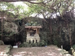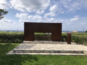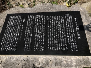 午後、シムクガマ、チビチリガマ、さとうきび畑歌碑広場に立ち寄り残波岬へ 読谷村は戦争によって多くの住民が亡くなりました。 また多いときは95%の土地が米軍基地として占有されていましたが少しずつ返還されているようです。 1945年4月1日米軍が沖縄西岸に上陸すると住民がガマ(自然豪)や亀公墓に身を隠しました。 住民の多くはチビチリガマとシムクガマに分かれて避難したそうです。 チビチリガマは集団自決場所でした。 そこには平和の像が有り心痛ましい思いをして帰りました。 またシムクガマは約1千人の住民が避難したそうですが比嘉平治さんと比嘉平三が住民を説得して投降、1千人前後が助かったそうです。