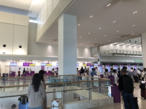 那覇市内から空港までのモノレール     新型コロナが増えているのにピーチの搭乗手続きカウンター前は混雑していました。😰😰😰