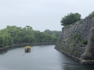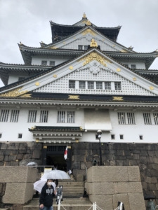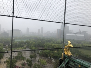 大雨の大阪城と天守閣内 大阪城天守閣は豊臣秀吉によって築城された大阪城の中心にそびえる天守閣の内部は歴史資料館となっており、展望台からは大阪の東西南北を一望でき年間250万人以上の来観客が来るとの事でした。
