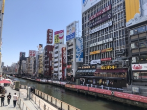 長堀通りの南側から宗右衛門通りまで南北に約580m続くミナミ随一の繫華街・グリコやかに道楽の看板がある道頓堀