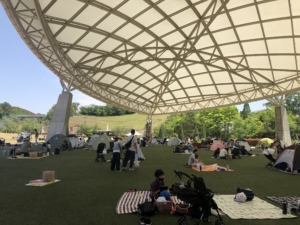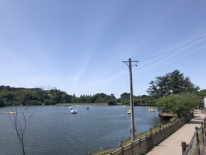 その後、鞍ヶ池公園へ 鞍ヶ池公園は豊田市の市街地東部にあり、かんがい池を中心に水辺テラス、水辺デッキ、プレーハウス、子供のプレイコーナー、植物園、桜園、芝生広場、観光牧場、動物ふれあい広場、植物園、英国庭園など1日たっぷり遊べる公園でした。 駐車場も約900台ほど入れるようになっており当日は満杯でした。