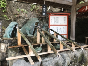 次に訪れたのは二見興玉神社(夫婦岩) 御祭神に猿田彦大神を祀り、開運や家内安全・交通安全に御利益があると言われいます。 正面には夫婦岩があり、その沖合約700m先に鎮まる、御祭神緑ろの「輿玉神石」と日の大神(太陽)を拝む鳥居の役目をしているそうです。 大小2つの岩が仲良く並ぶ姿から、夫婦円満や良縁成就を願う人が沢山来ていました。 我々もその二人かも😅😅😍😍 境内には御祭神のお使いとされる二見蛙(無事に帰る、お金が帰る)が沢山お奉納されてありました。