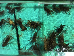 ホテルチャックアウト後、雨の中パールロードを南下。 途中活魚やイセエビを販売している食堂兼土産物屋さんを発見して立ち寄ってみました。 学生さんが5~6人で楽しそうに海鮮丼を注文して食べてました。
