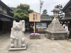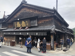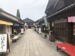中間位に江戸時代にタイムスリップした町並みのおかげ横丁がありみやげもの・食べ物・日本の神話をテーマにした体験施設・劇場などが有りました。 以前買って食べたコロッケや真珠店もいまだに営業しており懐かしく見学しました。