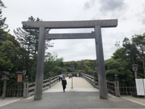 今日は私の誕生日、娘よりお祝いにホテル宿泊をプレゼントされました。 我が娘ながら良くできた子です。(親バカですかね~~😉😉😉) それはともかく今日の予定は人生2度目のお伊勢参り・二見で夫婦岩見学・鳥羽市ホテル3時チックインの予定で出発。 お伊勢参りは外宮~内宮の順で回るのが習わしですが今回も内宮(皇大神宮)のみ参拝しました。 ゴールデンウイーク後と言う事で駐車場は結構空いていました。 車も大きいので高さ制限が有って近くの駐車場に入れず河川敷の近くに駐車、伊勢神宮内宮の宇治橋前から猿田彦神社方面に真っすぐに続くおはらい町から内宮に向かいました。