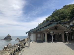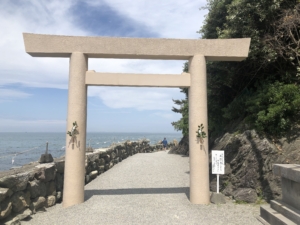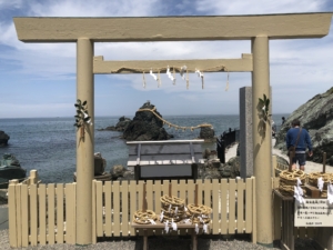 次に訪れたのは二見興玉神社(夫婦岩) 御祭神に猿田彦大神を祀り、開運や家内安全・交通安全に御利益があると言われいます。 正面には夫婦岩があり、その沖合約700m先に鎮まる、御祭神緑ろの「輿玉神石」と日の大神(太陽)を拝む鳥居の役目をしているそうです。 大小2つの岩が仲良く並ぶ姿から、夫婦円満や良縁成就を願う人が沢山来ていました。 我々もその二人かも😅😅😍😍 境内には御祭神のお使いとされる二見蛙(無事に帰る、お金が帰る)が沢山お奉納されてありました。