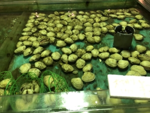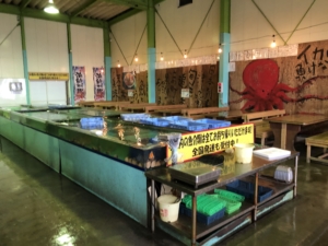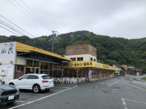 ホテルチャックアウト後、雨の中パールロードを南下。 途中活魚やイセエビを販売している食堂兼土産物屋さんを発見して立ち寄ってみました。 学生さんが5~6人で楽しそうに海鮮丼を注文して食べてました。
