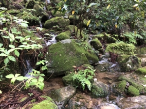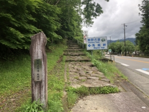 下山の途中、数組の登山者にも会いましたが、雨に濡れた石畳のため妻は3度も滑って転びましたが幸いケガをすること無く安心しました。 下山途中子供の夜泣き封じの伝説がある夜泣地蔵を見て鷲毛バス停の出口に到着。 残念ながら下山中は足元が滑って周りの景色を見る余裕がありませんでした。😅😅😅