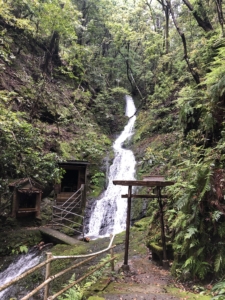 馬越不動尊で落下差20mの滝と不動明王を祀られている祠などを見ながら馬越公園へ。 展望台から尾鷲市内を一望できる展望台から街を眺め一休み。 雨でぬれている石畳の山道を峠に向けて登っていると初めて登山者に会い少し安心しました。