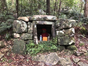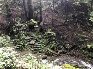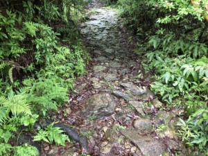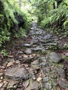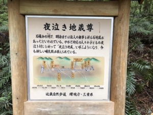 下山の途中、数組の登山者にも会いましたが、雨に濡れた石畳のため妻は3度も滑って転びましたが幸いケガをすること無く安心しました。 下山途中子供の夜泣き封じの伝説がある夜泣地蔵を見て鷲毛バス停の出口に到着。 残念ながら下山中は足元が滑って周りの景色を見る余裕がありませんでした。😅😅😅