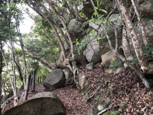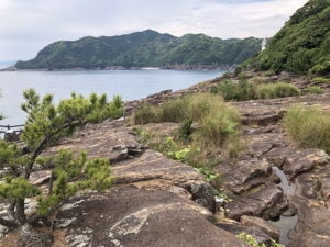 道の駅「海山」を出発、尾鷲市を後に熊野市に向かう途中道に迷い県道778号線に入ってしまい、目的地に30分で行ける場所を狭くて戻ることもできない道を1時間30分かけて通過しました。 妻は朝の運転訓練と言って私を励まし、笑っていましたが私には緊張の1時間30分でした。 そして到着したのが神武天皇の到着の地と伝えられている楯ケ岬、国道311号線から往復約2時間の遊歩道が整備されてありました。 軽い気持ちで水も持たず出発したら1山2山越えのきつい道のりでした。