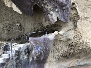 その後、長年にわたる厳しい自然環境が生み出した壮大な造形美の世界遺産「鬼ケ城」へ 無料駐車場に車を停め、鬼ヶ島センター前を通って全長1.2㎞の遊歩道を散策、「猿の涙」・「鬼の風呂桶」・「鬼の見張り台」などの観光スポットを見ながら東口出口に抜けましたが、帰り道が分からず地元のお兄さんに聞いたら教えてくれたので後に付いていきました。 東出口をでると直ぐにトンネルがありますが歩行者は通行できず、川沿いの小道を通て行くと半分が歩道で、半分が一方通行の車が通れる鬼ケ城歩道トンネルがありました。 このトンネルは大正14年(1915年)完成した手掘り感のあるトンネルで入り口には「選奨土木遺産」の額が貼ってありました。