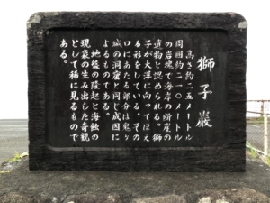 熊の駅はとてもきれいな駅舎でしたが周りには商店街らしいお店がありませんでした。 駅を通過して国道42号線の交差点にあたる所に世界遺産の高さ25m獅子岩がありました。 古くから隣の神仙洞とともに熊野市山中の大馬神社の狛犬とされているそうです。