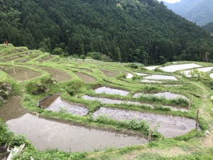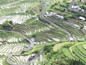午前雨が降っていたので今日の観光を中止し、スーパーで買い物・車に給油をして山崎運動公園で休憩。 この辺では軽油の値段が高い所で163円、数十メートル離れたGSでは136円で販売していました。 最近は値段表示のないスタンドが多く給油しながら詐欺に有っている様な気にもなりました😰😰😰。 少し休んでいると天気も回復してきたので今日予定していた丸山千枚田を見に行く事にして急遽国道311号を北上。 丸山千枚田は紀和町の丸山地区にあり、日本棚田百選に選ばれています。 昭和40年頃から始まった稲作転換対策や高齢化・過疎化などにより平成初期には530枚までに減少したそうです。 それで平成5年に地元民が立ち上がり、丸山千枚田保存会を結成、復元と保存活をおこない現在の姿となったそうです。 約1340枚もある棚田の景観は今まで見た棚田の中では一番の大きさと美しさでした。6月最初の土曜日には虫送り行事が行われ、松明かりが灯された千枚田は幻想的だそうです。 通り峠登山口に車を駐車して丸山千枚田へ向けて歩きましたが熊野古道同様、苔の石畳の坂道があり、その途中に子安地蔵が祀られており、そこから展望台に行く別れ道がありました。 雨上がりの苔の付いた石畳を登って来た我々には流石にきつく、登頂を諦めようと思いましたが折角ここまで来たので『登ろう・!』と励ましあい最後の170段の急階段を登りました。 展望台に到着して前方見た時言葉では言い表せないすばらしい絶景がありました。 下山しながら二人で「棚田を見るなら展望台に来なくては損」といいながら降りて来ました。 下山後棚田の細道や自動車道をあるきながら駐車場まで約3時間、とても素晴らしい風景を見てきました。