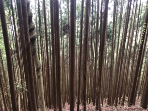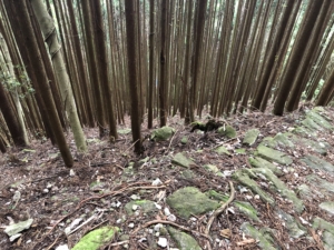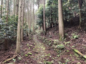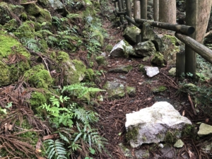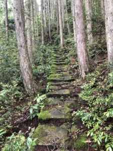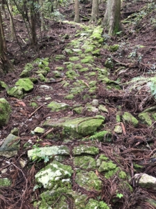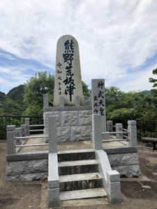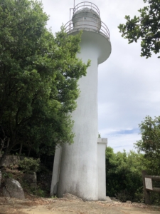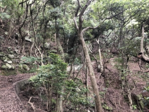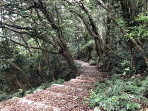 道の駅「海山」を出発、尾鷲市を後に熊野市に向かう途中道に迷い県道778号線に入ってしまい、目的地に30分で行ける場所を狭くて戻ることもできない道を1時間30分かけて通過しました。 妻は朝の運転訓練と言って私を励まし、笑っていましたが私には緊張の1時間30分でした。 そして到着したのが神武天皇の到着の地と伝えられている楯ケ岬、国道311号線から往復約2時間の遊歩道が整備されてありました。 軽い気持ちで水も持たず出発したら1山2山越えのきつい道のりでした。