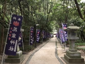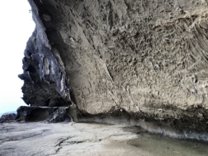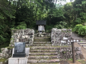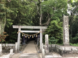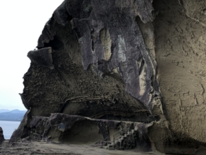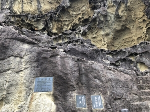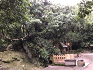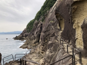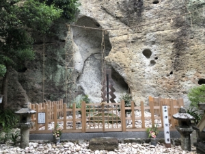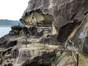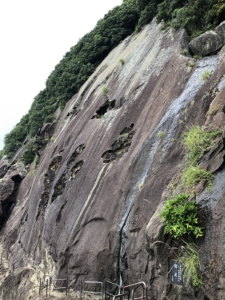 獅子岩から少し離れたところに世界遺産の花窟神社(はなのいわやじんじゃ)がありました。 花窟神社はは太古の自然崇拝の姿を今に残す日本最古の神社と言われており、国や神を生んだイザナミノミコトが葬られたとされ、黄泉の国と接する場所でパワースポットとして有名です。 高さ約70mの巨岩がここの御神体で社殿はありません。 2月と10月には古式ゆかしい行事がるそうです。