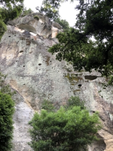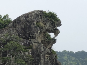熊の駅はとてもきれいな駅舎でしたが周りには商店街らしいお店がありませんでした。 駅を通過して国道42号線の交差点にあたる所に世界遺産の高さ25m獅子岩がありました。 古くから隣の神仙洞とともに熊野市山中の大馬神社の狛犬とされているそうです。
