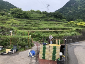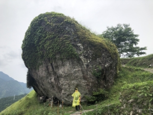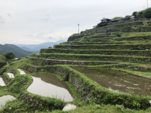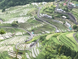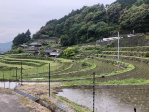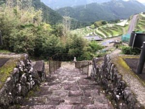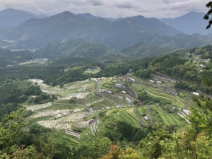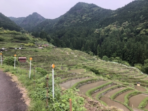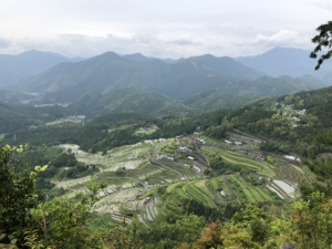午前雨が降っていたので今日の観光を中止し、スーパーで買い物・車に給油をして山崎運動公園で休憩。 この辺では軽油の値段が高い所で163円、数十メートル離れたGSでは136円で販売していました。 最近は値段表示のないスタンドが多く給油しながら詐欺に有っている様な気にもなりました😰😰😰。 少し休んでいると天気も回復してきたので今日予定していた丸山千枚田を見に行く事にして急遽国道311号を北上。 丸山千枚田は紀和町の丸山地区にあり、日本棚田百選に選ばれています。 昭和40年頃から始まった稲作転換対策や高齢化・過疎化などにより平成初期には530枚までに減少したそうです。 それで平成5年に地元民が立ち上がり、丸山千枚田保存会を結成、復元と保存活をおこない現在の姿となったそうです。 約1340枚もある棚田の景観は今まで見た棚田の中では一番の大きさと美しさでした。6月最初の土曜日には虫送り行事が行われ、松明かりが灯された千枚田は幻想的だそうです。 通り峠登山口に車を駐車して丸山千枚田へ向けて歩きましたが熊野古道同様、苔の石畳の坂道があり、その途中に子安地蔵が祀られており、そこから展望台に行く別れ道がありました。 雨上がりの苔の付いた石畳を登って来た我々には流石にきつく、登頂を諦めようと思いましたが折角ここまで来たので『登ろう・!』と励ましあい最後の170段の急階段を登りました。 展望台に到着して前方見た時言葉では言い表せないすばらしい絶景がありました。 下山しながら二人で「棚田を見るなら展望台に来なくては損」といいながら降りて来ました。 下山後棚田の細道や自動車道をあるきながら駐車場まで約3時間、とても素晴らしい風景を見てきました。
