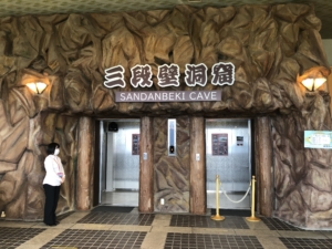 三段壁は千畳敷と同じく、かつてのの浅い海の底が隆起した海岸段丘で、高さが50m、長さが2㎞にも達する海に直立する崖(海食崖)と波によって削られた洞窟(海食洞)がみどころです。 三段壁洞窟は平安時代、源平合戦で知られる熊野水軍が船を隠したという伝説が残る洞窟です。 現在は地下までエレベーターで降り約200mの洞窟内を観光できるようになっており番所小屋なども再現されていて、かつての戦いの様子を見る事ができました。