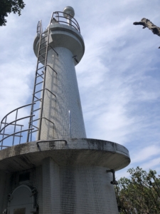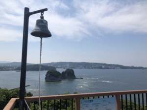 日曜日とあって駐車場にも多くの観光客が来るようになったので近くの三段壁を見学した後白浜の街や円月島・塔島が良く見える番所山公園に向かいました。 公園に行く途中の湾内で白浜のシンボルである円月島(島の中央に穴がある)が目の前にあり見えました。 秋分・春分の時期には、中心部の海蝕洞を通して夕陽を見る事ができるそうです。公園内には南方熊楠記念館や京都大学白浜水族館がありました。
