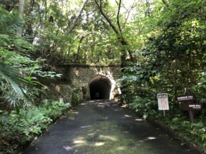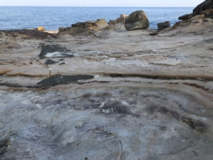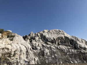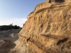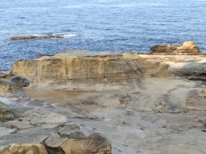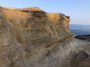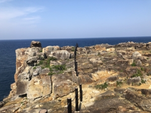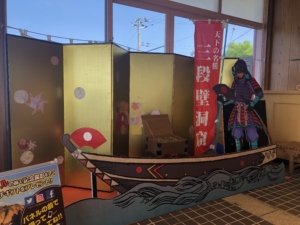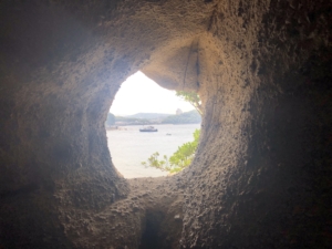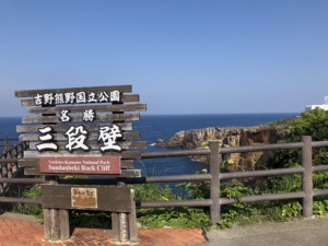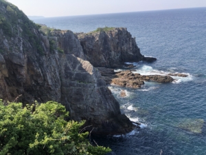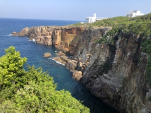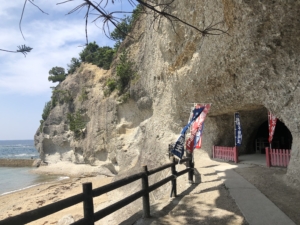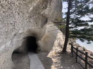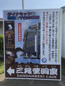 三段壁は千畳敷と同じく、かつてのの浅い海の底が隆起した海岸段丘で、高さが50m、長さが2㎞にも達する海に直立する崖(海食崖)と波によって削られた洞窟(海食洞)がみどころです。 三段壁洞窟は平安時代、源平合戦で知られる熊野水軍が船を隠したという伝説が残る洞窟です。 現在は地下までエレベーターで降り約200mの洞窟内を観光できるようになっており番所小屋なども再現されていて、かつての戦いの様子を見る事ができました。