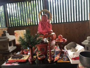 常喜院にある願いが叶うイスと赤い地蔵さん  夫婦で長生きするように座ってみました。