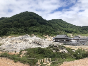 今日は下北半島をぐる~と一周する予定で出発。 最初に日本三大霊場にかぞえられる恐山へ向かいました。 恐山は約30年前に一度行った事があり、信仰と祈りの場として、個人を偲ぶために全国から多くの人達が足をはこんできています。 火山活動によって形成された宇曽利山湖などのジオサイトを見ることができます。 火山ガスの噴出する岩肌の一帯は地獄に、そして湖をとりまく白砂の浜は極楽になぞえられているとの事でした。 見学後、温泉に入って清めて来ました。 元来温泉は「清めの湯」と言われ参拝する前に浴びてから入山したそうですが、我々は逆でした😅😅😅。 温泉が4つ有りますがいずれも源泉かけ流し。 更衣室と浴室は板一枚で隔てられただけのシンプルな作りで洗い場なし。 湯は肌がピリピリするほどの強酸性で温度も高めでしたので加水して私は数秒で入浴くしました😅😅😅。(現地には源泉温度の表示が有りませんが、70℃前後といわれています。)