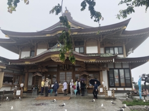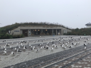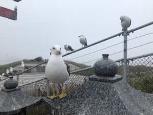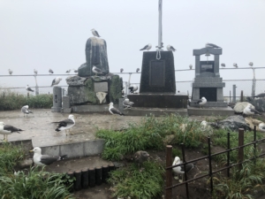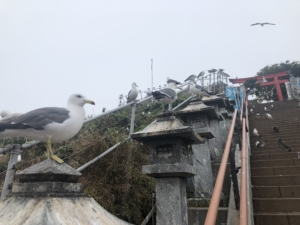 久慈市を後にしてせんべい汁でも有名な八戸市を訪れました。 八戸市の観光スポットと言えば蕪島です。 蕪島はウミネコの繁殖地として国の天然記念物に指定されいます。 2015年の火災によって全焼しましたが、ウミネコの繁殖時期(4月~8月)に工事ができず約5年の歳月をかけて再建したとの事でした。 神社を参拝するには雨でもないのに傘が必要との事で入口に傘が準備して有りました。 ウミネコが沢山住んでおり空からウミネコの「うんち」が降ってくるためで、我々も参拝するに匂いと糞の多さに散々でした😭😭😭。