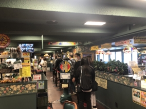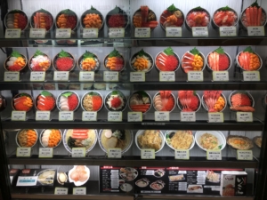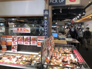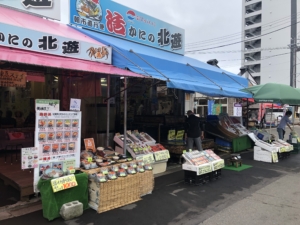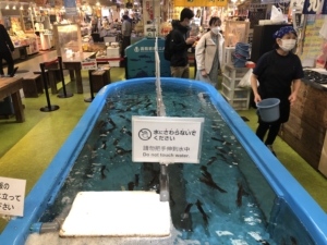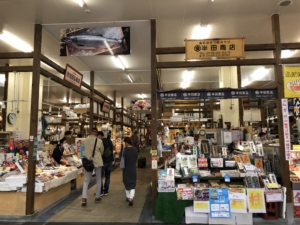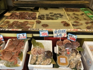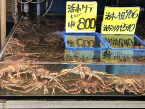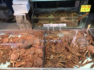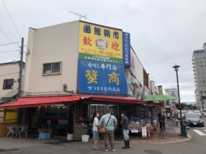 函館駅周辺の市場 北海道随一の大市場とよばれる「函館朝市駅二市場」は新鮮な魚介類や塩干物、お土産品、衣料品やお菓子、食堂まで全ての物が揃う市場で大変多くの観光客で賑わっていました。