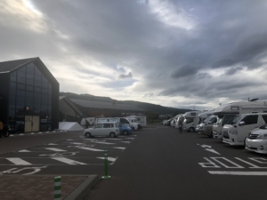 朝目が覚めて周りを見渡すと、なんとキャンピングカーの展示会の様に沢山のキャンパーが宿泊していました。 ゆっくりと出発の準備をして本日の観光地・大沼公園を目指し出発・