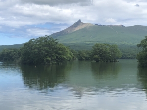 湖の向こうに見えるのが北海道駒ヶ岳です。 もともと富士山と同じ形をした山でしたが噴火の為、現在の形になったそうです。 駒ヶ岳の標高は1,131mで現在も火山活動が活発なため平成10年から禁止していましたが「馬の背」地点まで入山が緩和されているそうです。