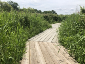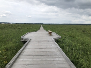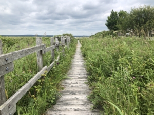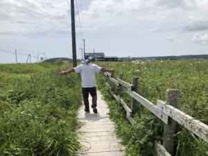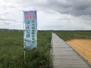 霧多布湿原センターは厚岸道立自然公園にある施設で、国内で5番目に広い「霧多布湿原」を見渡せる高台に建てられいました。 館内には湿原に関する展示や図書室、カフェなどが完備されています。 カフェで地物で造られた濃厚な牛乳を飲み喉を潤し、センター前にある湿原内木道のトレッキングに出かけました。 湿原の中心部は泥炭で形成されており、大正11年(1922)に国の天然記念物に指定されたそうです。 別名「花の湿原」と呼ばれエゾカンソウやノハナショウブをはじめ、沢山の花々が咲き乱れていました。