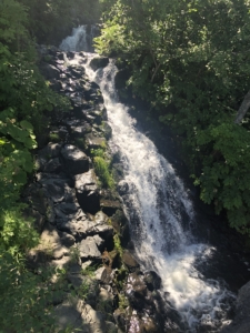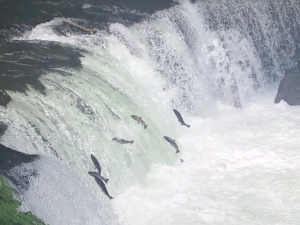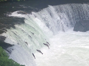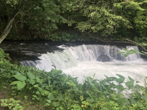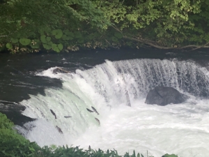 さくらの滝 清里町にある高さ3.7mの滝ですが、6月から8月の時期に滝をサクラマスが遡上することからその名が付けられたそうです。 私達が行った時には水量が多く何度も何度もサクラマスが飛び跳ねて、滝を登る遡上風景が生命の力強さを感じとても感動的で見応えがありました。 川で生まれたヤマメが海に下り、やがて大きく成長してサクラマスとなり、産卵のために川に戻ってくるそうで、銀色に輝く体をくねらせて滝を飛び越え、生まれ育った故郷の川に帰るのですが、大きな滝を超える事のできる鱒はほんの一部との事でした。