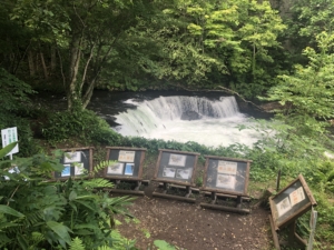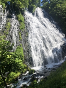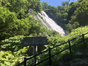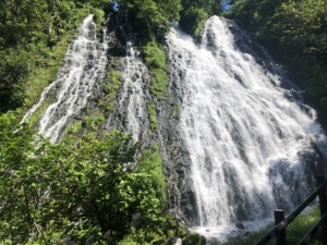オシンコシンの滝 アイヌ語で「エゾ松が群生する所」という意味の「オ・シュンク・ウシ」から転じたとされるオシンコシンの滝は落差約30m、途中から流れが二つに分かれていることから「双美の滝」とも呼ばれており、「日本滝100選」にも選ばれています。 滝の中ほどまでの高さまで階段で上ることができ、水量が多い当日はしぶきが掛かるほど目の前で見られとても迫力がありました。