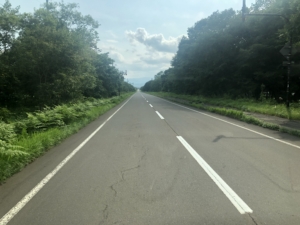 北海道の道は写真の様に何キロも続く真っすぐな道が多いです😅。