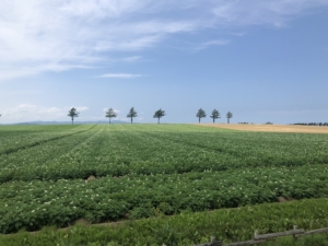 めまんべつメルヘンの丘 ゆるやかな丘陵地に連なる畑が、季節ごとにのどかな風景描くビューポイント。 黒澤明監督の映画「夢」のロケ地になった所だそうです。 額に入れても良いような素敵な写真が撮れました。
