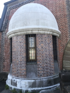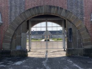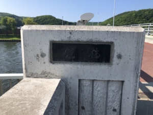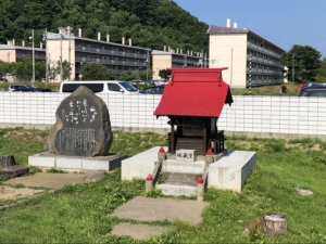 橋を渡ってすぐにお宮と石碑がありました。 その後ろには刑務官が住むアパートが建っており 雰囲気は結構寂しく、殺伐としていました。