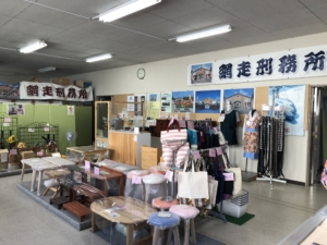 刑務所内の受刑者が造った作品を販売している店 店内には木工製品、小物民芸品、金属・皮製品、アイヌ模様シリーズ製品などが陳列され、網走市民や観光客に販売していました。