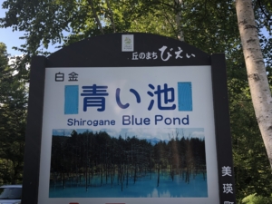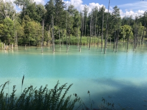 白金青い池 十勝岳の防災工事の際に偶然堰提に溜まった水が不思議なほど青い色(コバルトブルー)になり、立ち枯れたカラマツとあいまって幻想的風景になっている池。 この日はお盆とあって駐車場は満杯で池の周りには沢山の観光客で埋め尽くされていました。