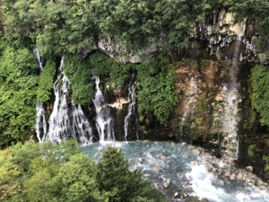 白しげの滝 国内でも有数の地下水の滝、コバルトブルーに輝く美瑛川本流にかかり、十数条の細い糸を引くように落水する美しい景色を橋の上から見る事ができました。