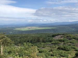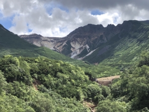 望岳台 標高930mの十勝岳望岳台は、大雪山国立公園十勝岳本峰の真下にあり、大雪山の主峰旭岳を始め美瑛岳、美瑛富士、神富良野岳などが手に取るように見えました。 眼下には旭川市から富良野市までの360度が見え夏は登山基地となっており、この日も沢山の登山者が頂上に向かった登っていました。
